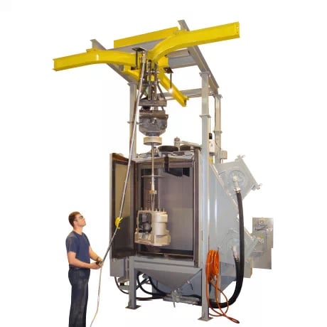 El modelo Spinner Hanger procesa automáticamente una sola pieza grande o lotes de piezas de varios tamaños cargadas en un accesorio de sujeción hecho a la medida. Un gancho gira y hace oscilar la pieza/fijación cargada hacia delante y hacia atrás para exponer todas las superficies a la solución limpiadora y al granallado abrasivo acelerado. Esta combinación de rotación y oscilación frente al patrón de granallado del lodo garantiza una cobertura uniforme y completa de los componentes geométricamente complejos.
