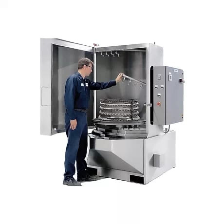 The PROCECO TYPHOON®-PC parts washer is designed for aqueous cleaning and degreasing of medium-to-larger-size workpieces that can be loaded directly onto its larger 62-inch diameter, cabinet-mounted turntable, This front-loading industrial parts washer combines pressure, heat, and an aqueous cleaning solution to clean and degrease your parts in minutes.